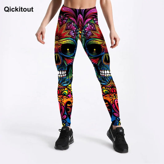 Colorful Skull & Leaf Printed Slim Workout Leggings